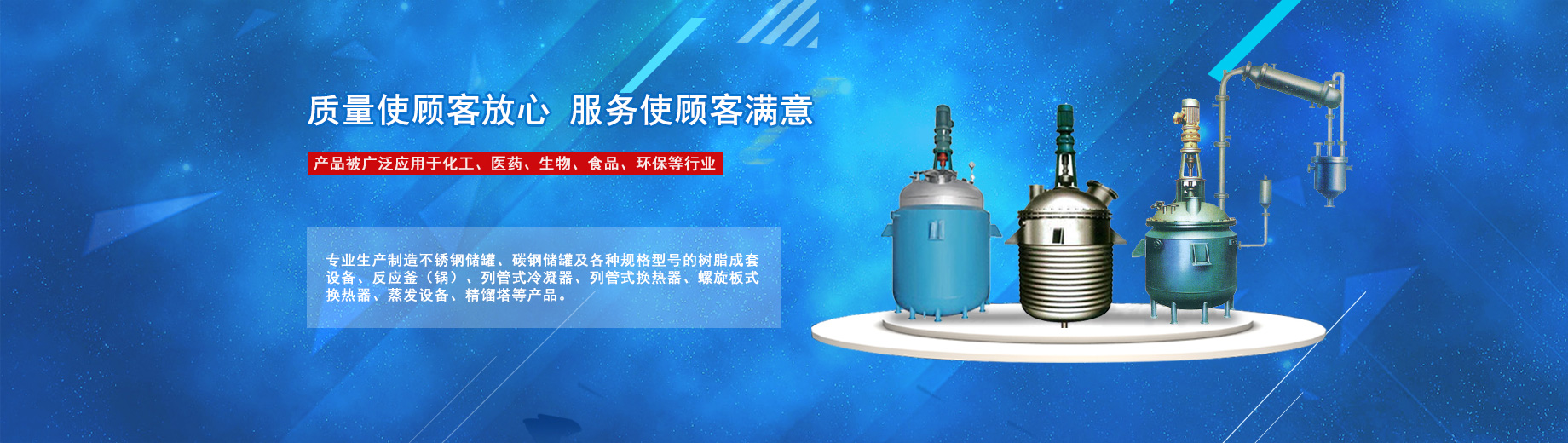 公司專(zhuān)業(yè)生產(chǎn)制造不銹鋼儲(chǔ)罐、碳鋼儲(chǔ)罐及各種規(guī)格型號(hào)的樹(shù)脂成套設(shè)備、反應(yīng)釜(鍋)、列管式冷凝器、列管式換熱器、螺旋板式換熱器、蒸發(fā)設(shè)備、精餾塔等產(chǎn)品,被廣泛應(yīng)用于化工、醫(yī)藥、生物、食品、環(huán)保等行業(yè)。